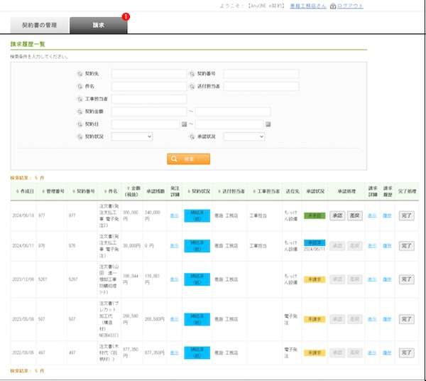 また、工事後の請求は、元請け会社にメールで通知され、専用ウェブサイトで工事の発注データに紐づいた請求内容の確認が可能。請求承認や差し戻しを行うこともできる。
