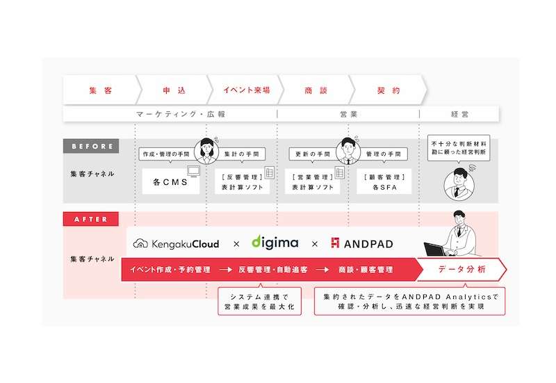 Digimaで集めたデータをそのままANDPADに連携できるようになれば、入り口となる集客の反響データが定量的に網羅されているので、業務の効率化はさらに高まる。「発信した媒体ごとの集客率、媒体ごとにかけているコスト、営業担当者ごとの生産性など様々な角度から業務効率が数値化できるので、集客→受注の流れのなかでどこに手を打てばいいのかがわかる」(美里さん)。