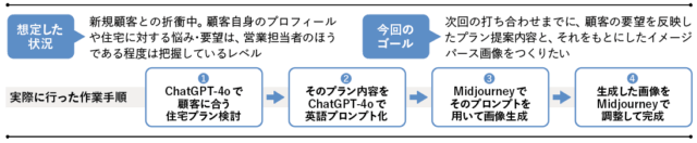 生成AIを用いる際のハードルはさまざまあるが、「求めるものを出すまでに時間がかかりそう」「英語だからどうしたらいいかわからない」といった声を多く聞く。そこで本誌編集部が、本特集の事例内に登場した生成AI「ChatGPT-4o」(言語系)と「Midjourney」(画像系)を用いて、工務店の実務に役立つ流れを想定して実践。自社の実務に落とし込む際の参考にしてほしい。