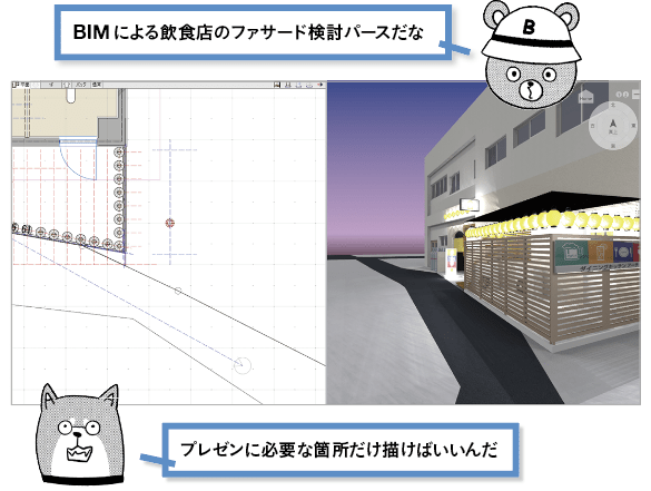 | BIMは細部まで描かなければ作図時間は短い。プレゼン時は簡易図面を作成。コストナビで概算し、受注後に進行に応じて描き込む |