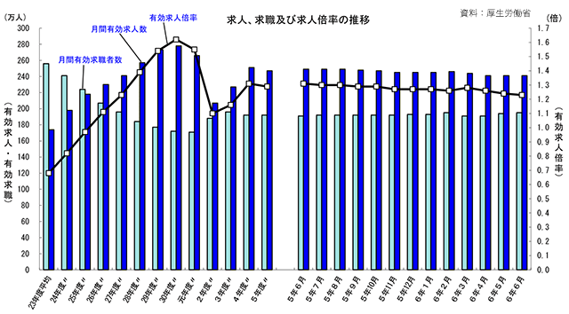 厚生労働省が7月30日に公表した2024年6月分の一般職業紹介状況によると、建設業(採掘含む)の有効求人倍率は4.80倍で、前年同月比で0.27ポイント低下。新規求人倍率は8.33倍で、同0.15ポイント低下した。全産業の有効求人倍率は1.23倍で、年間を通じてほぼ横ばいに推移している。
