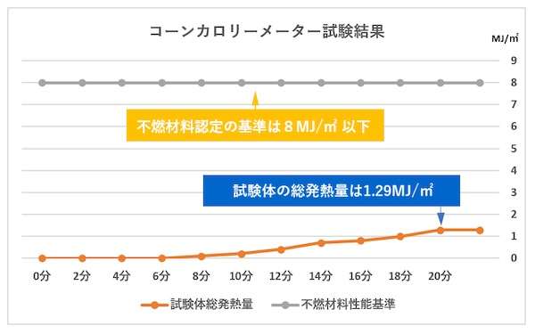 不燃材料の性能基準である総発熱量8MJ/㎡以下に対し、試験体は1.29MJ/㎡だった。