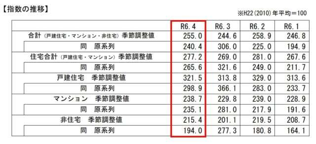また、住宅合計・季節調整値は前月比3.0%増の277.2、戸建住宅の季節調整値は前月比2.5%増の321.5、マンションの季節調整値は前月比3.9%増の238.7、非住宅の季節調整値は前月比7.1%増の215.4だった。