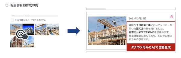 スマートフォンのアプリ内で写真を撮影し、その写真の状況が分かるタグ付けをすることで、AIが報告書を自動作成する。タグ付けされた写真はクラウドに自動アップデートされて管理グループ内で整理され、作成された報告書はすぐに同じ管理グループのメンバーに共有される。