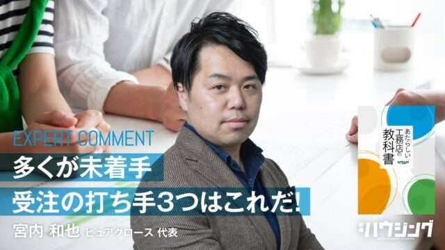 これまで堅調だった年間新築20棟以上の工務店の多くが、集客量の減少と契約率の低下に悩んでいる。そこで工務店経営をトータルに支援しているピュアグロース代表の宮内和也さんに、新建ハウジング読者の多くが未着手だと思われる受注の打ち手を3つお聞きした