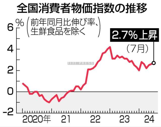 総務省が8月23日発表した7月の全国消費者物価指数(2020年=100)は、価格変動の大きい生鮮食品を除く総合指数が108.3と、前年同月比2.7%上昇した。35カ月連続で前年を上回り、上げ幅は3カ月連続で拡大した。政府の負担軽減策がいったん終了した影響で、電気代の上昇率が43年4カ月ぶりの大きさとなったほか、都市ガスも大幅に値上がりした。