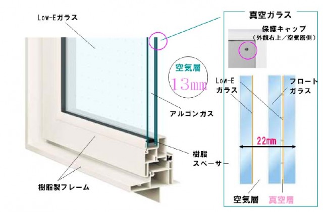 0.2mmの真空層を設けることで熱伝導を極限まで抑え、より高い断熱効果を発揮しながら、総厚は複層ガラスと同等の22mmで、今までのフレームに収まるスリムなデザイン。ガラス面積が広いので日差しを十分に取り込むことができる。