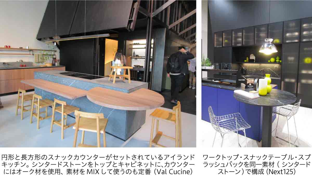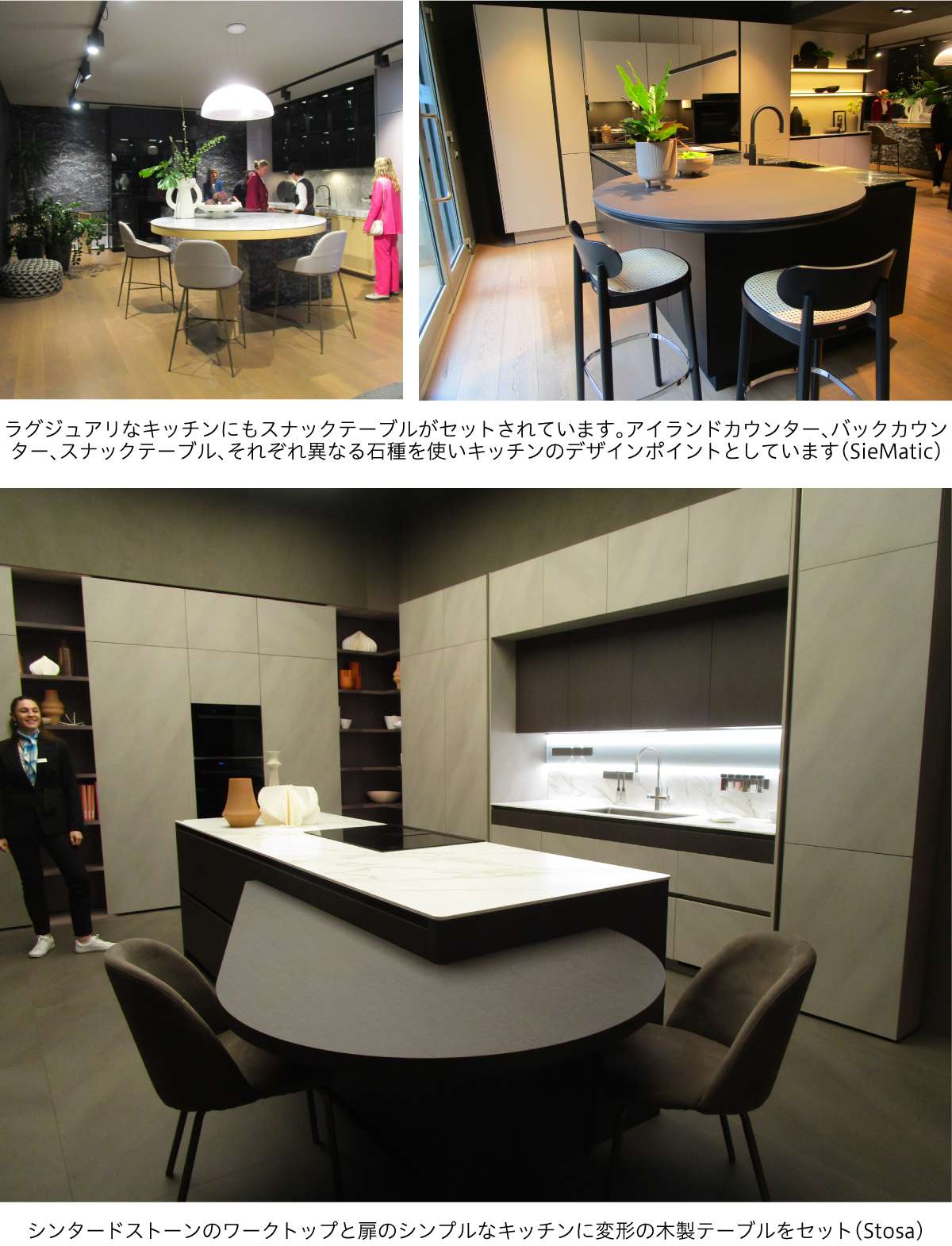 示し合わせたかのようにデザインされた『アイランドキッチン+スナックテーブル』スタイル。多くは円形フォルムでしたが、楕円や角型、オーガニックな曲線のデザインも見られました。