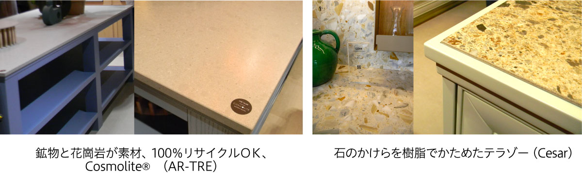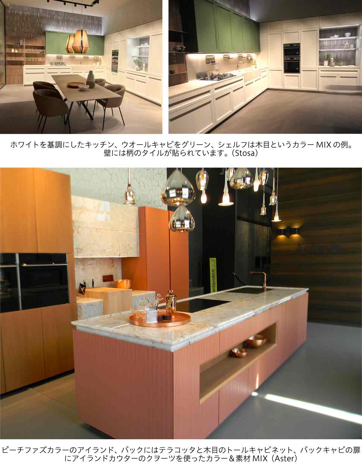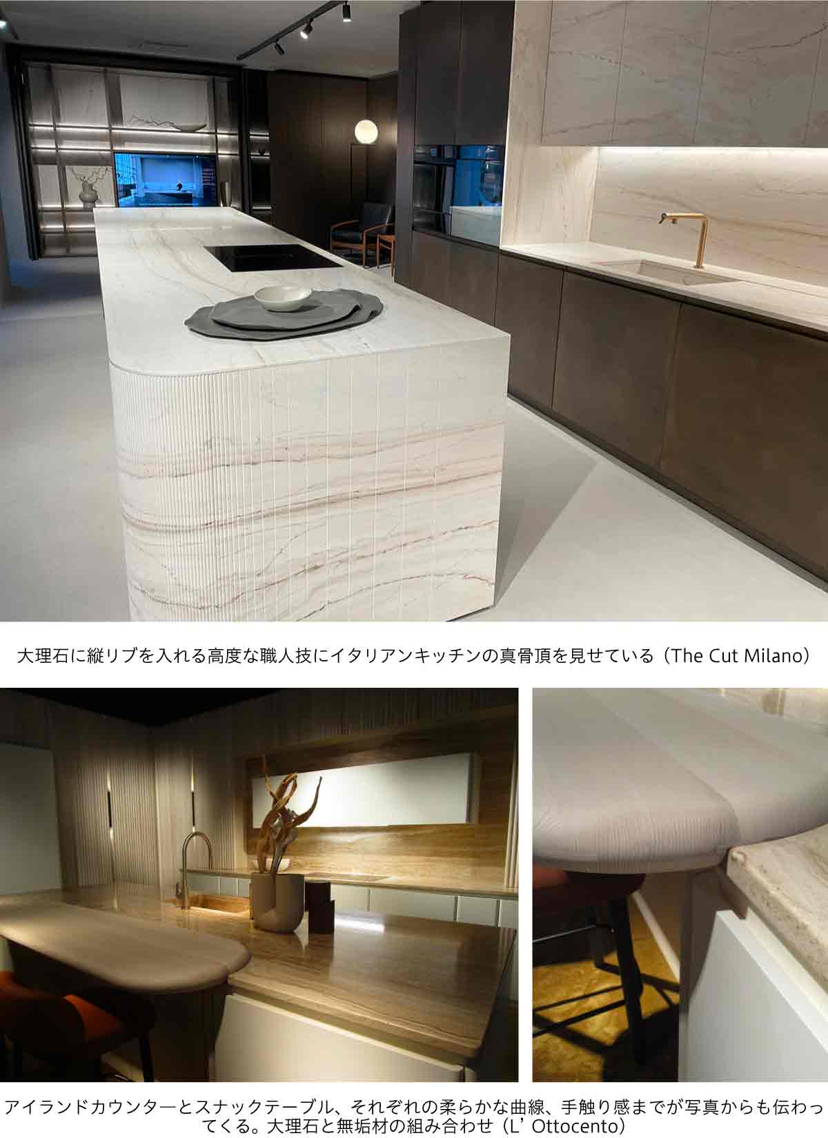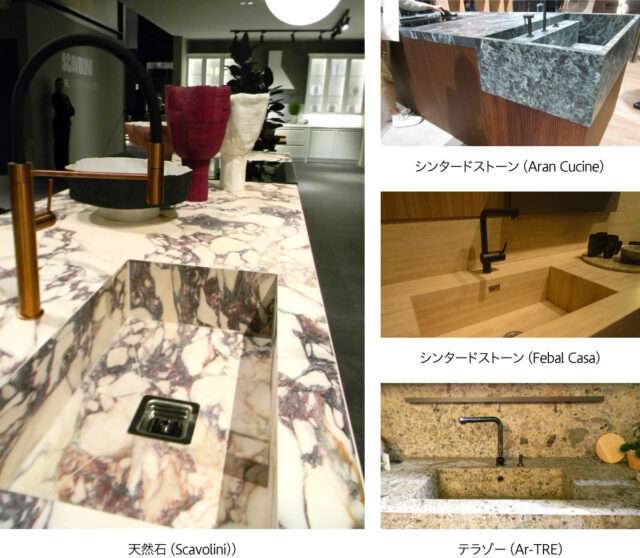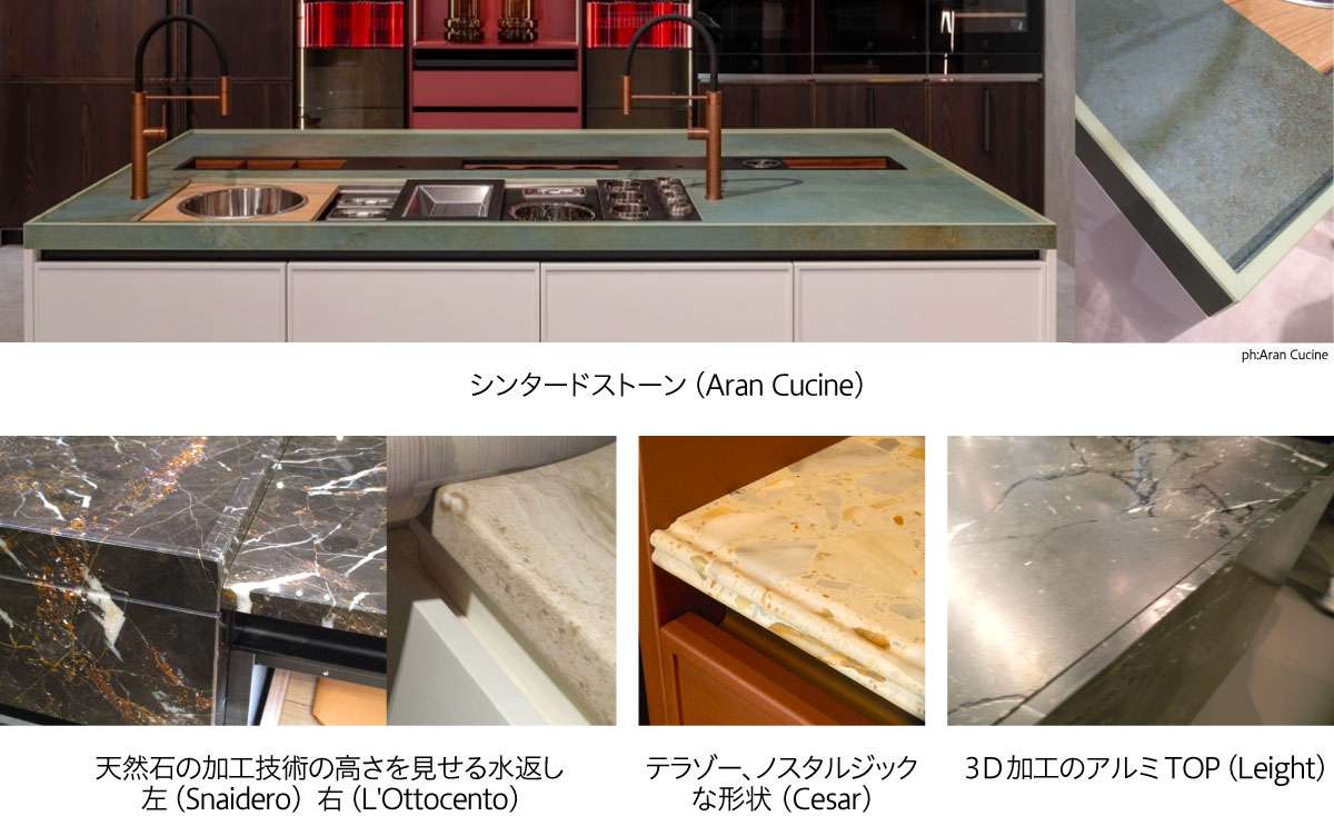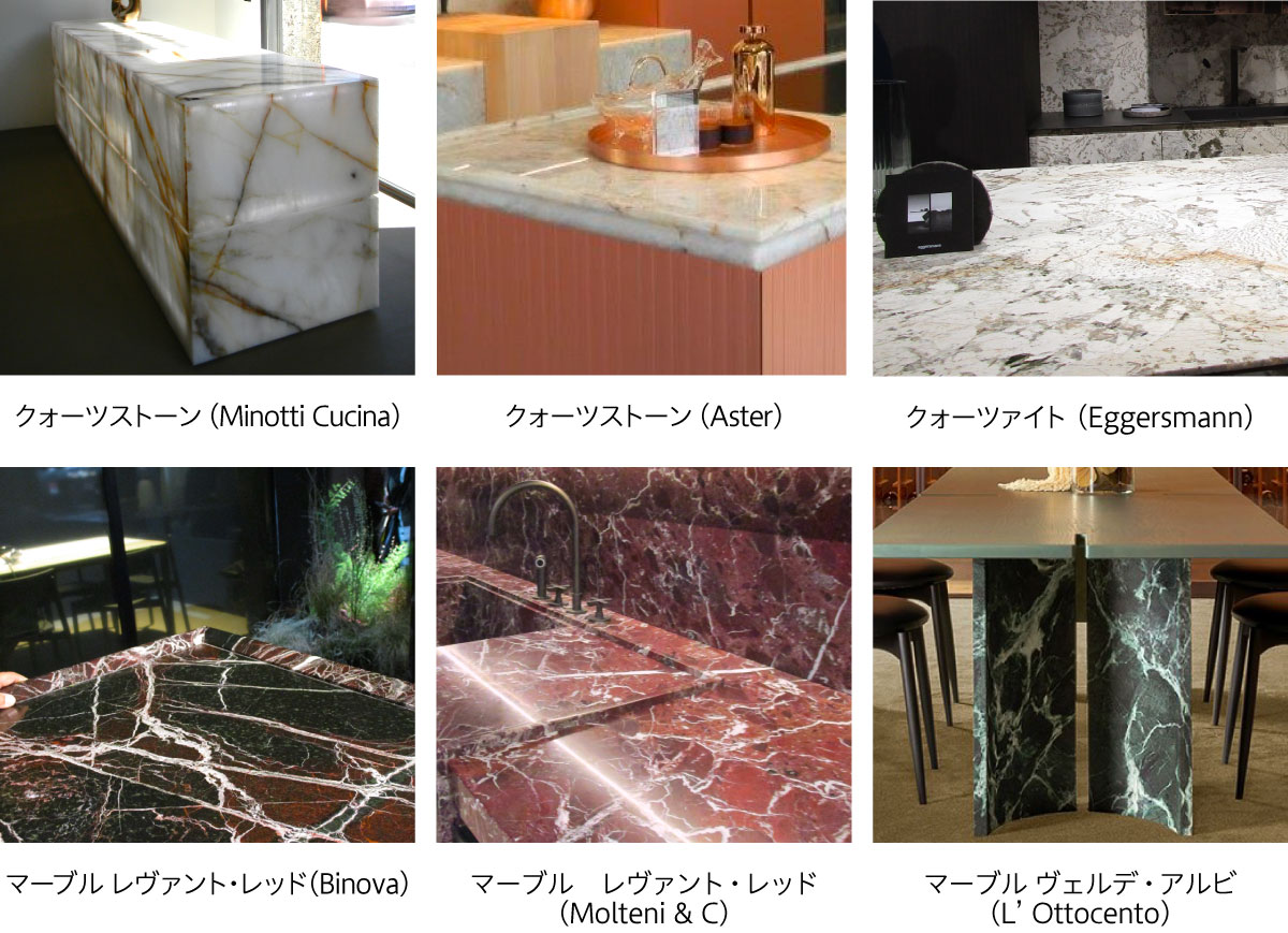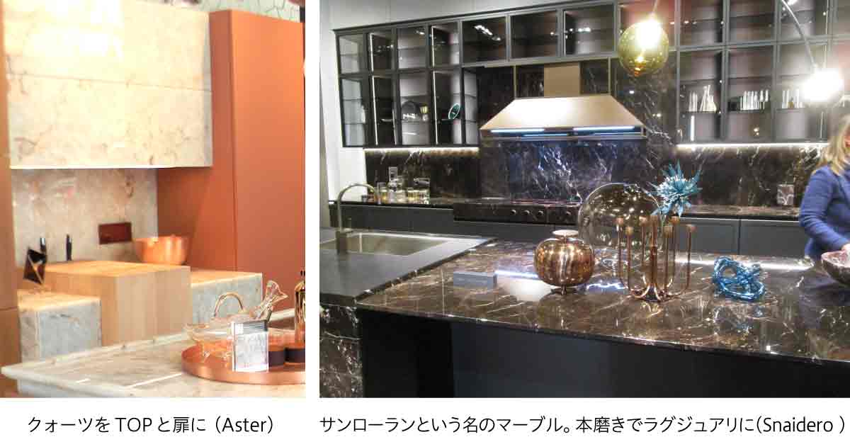 「石の文化の国イタリア」を思いっきりアピールするかのように天然石を使ったワークトップが増加、各社のメインデザインに使われています。淡いピンク系のクオーツ(石英石)、トラバーチン、ボルドーやグリーン、ブラック系等の濃色のマーブル(大理石)、など個性の強いラグジュアリな石種が人気でした。