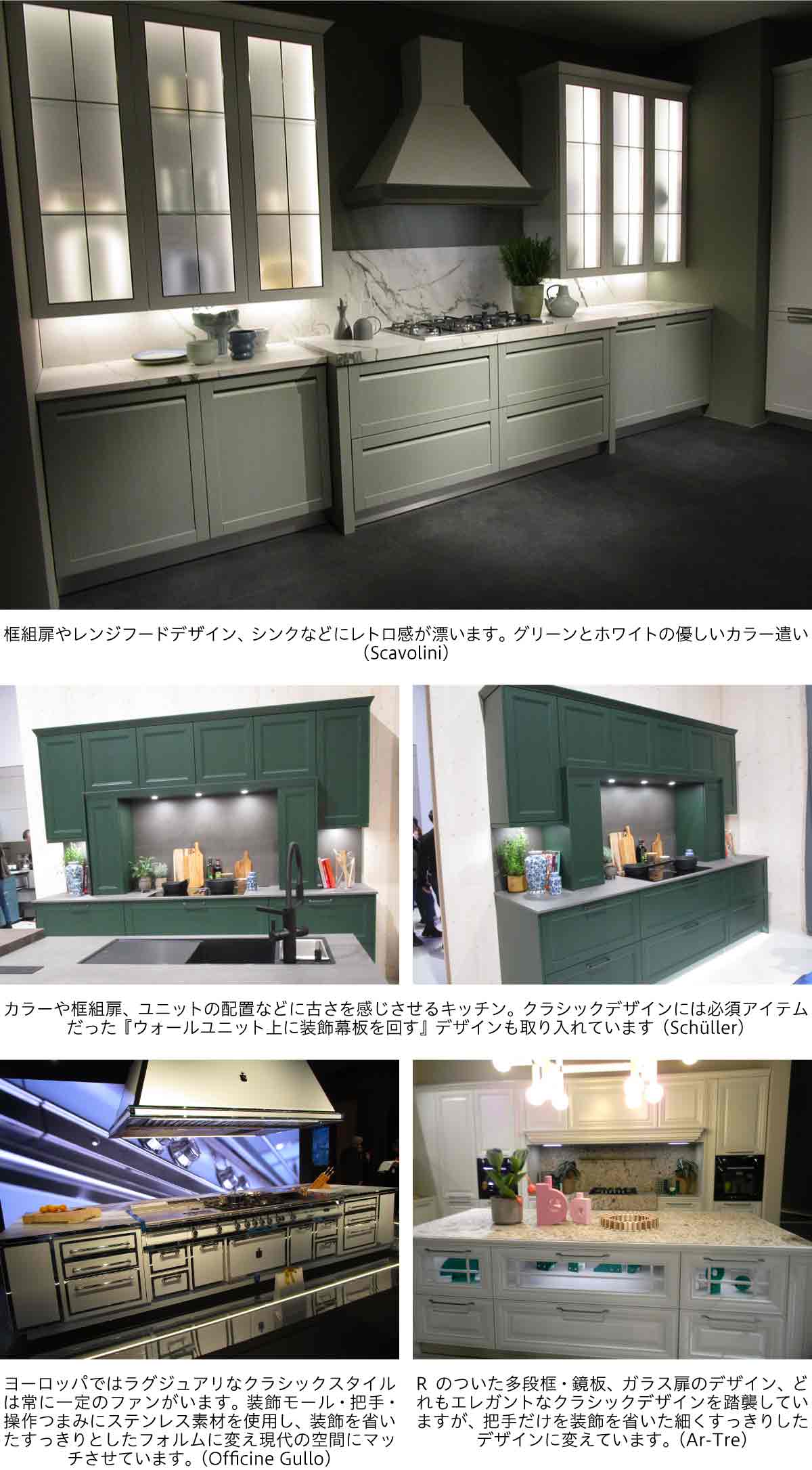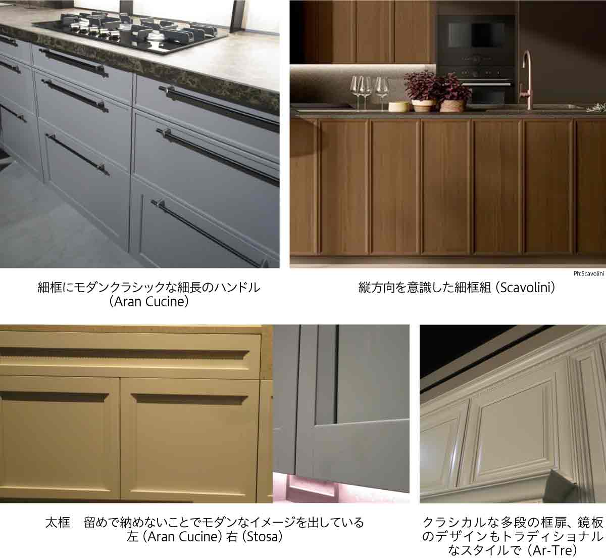 姿をひそめていた框組扉が増えています。10㎜程の細框から太めの框、多段框など、多彩な形状が見られました。モダンからレトロ・クラシックデザインまで幅広く使われています。