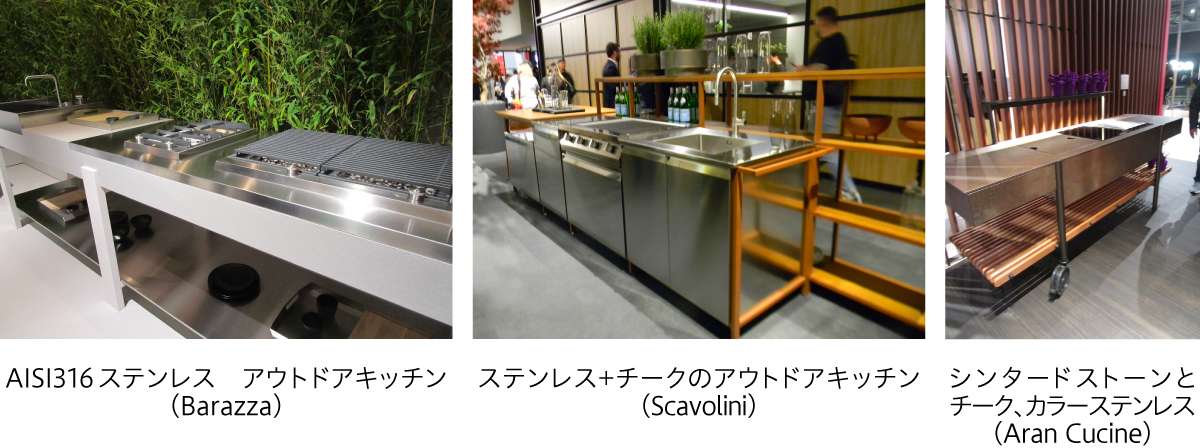 アウトドア志向の高まりを受け人気のアウトドアキッチンの提案。耐候性や耐塩性に優れたステンレス(AISI316)、アルミニュウム、熱処理木材、チーク材等が使われました。