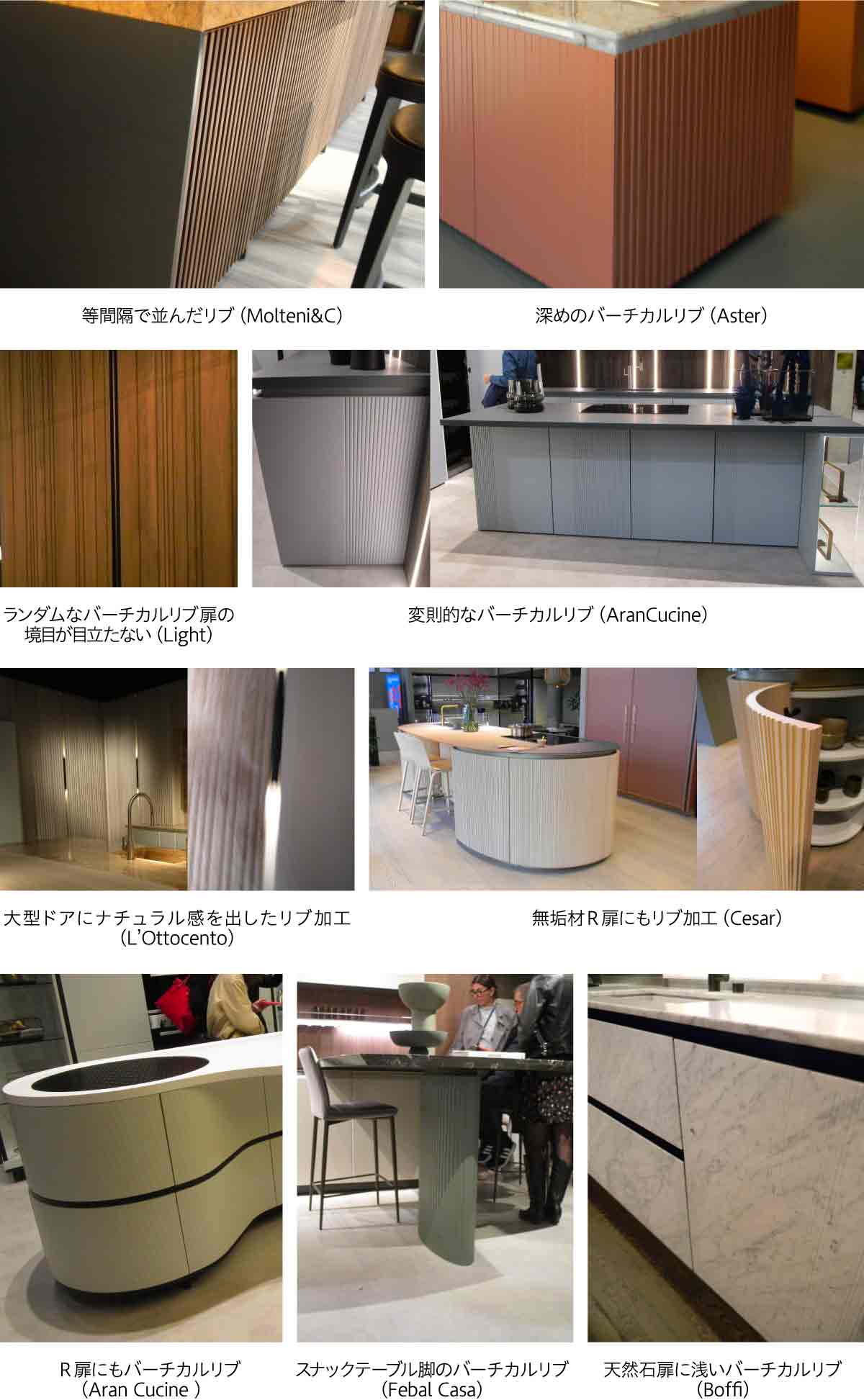 フェースともよばれるキッチンデザインのカナメ『扉』。今年のキッチン扉のトレンドは、なんといってもバーチカルリブと框組扉。PVD加工のメタル扉や様々な加工を施したガラス扉等も注目をあびていました。