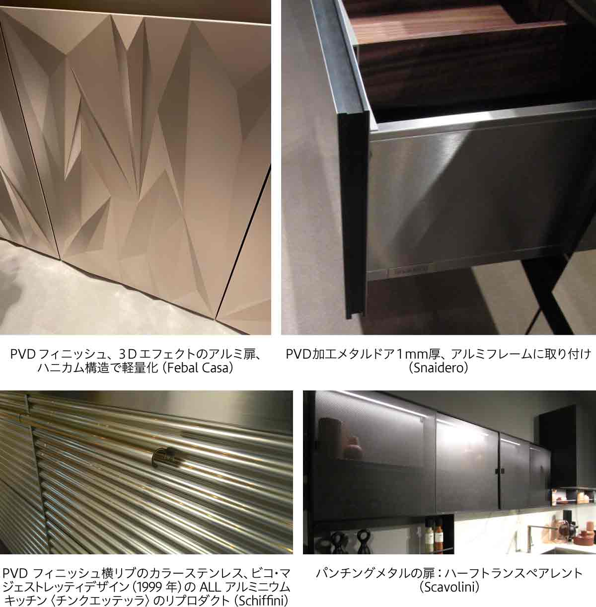 PVD加工(Physical Vaper Deposition)のメタルドア、着色やスクラッチ加工・鏡面仕上げなどに加えて、高度なテクニックを要する3Dやリブ加工も登場しました。技術革新の進む分野として注目を集め、ドア材だけでなくワークトップにも使われています。