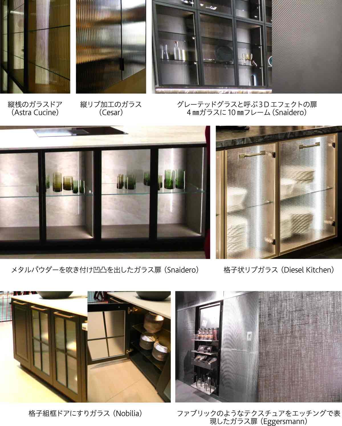 人気の高かったガラスドア。凹凸加工・サンドブラスト・ファブリックテイストなど多彩なパターンが使われていました。いずれもハーフトランスペアレント(半透明)な見せかたです。