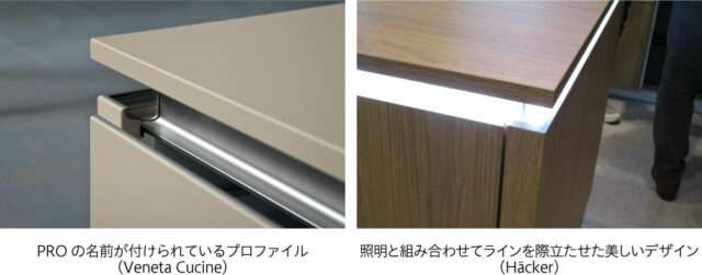 ドアの上部の突出部をハンドルとして使用するいわゆる『手かけ』スタイルのベースユニット、キャビネット側にアルミプロファイルを取り付け、扉はプッシュオープン。
