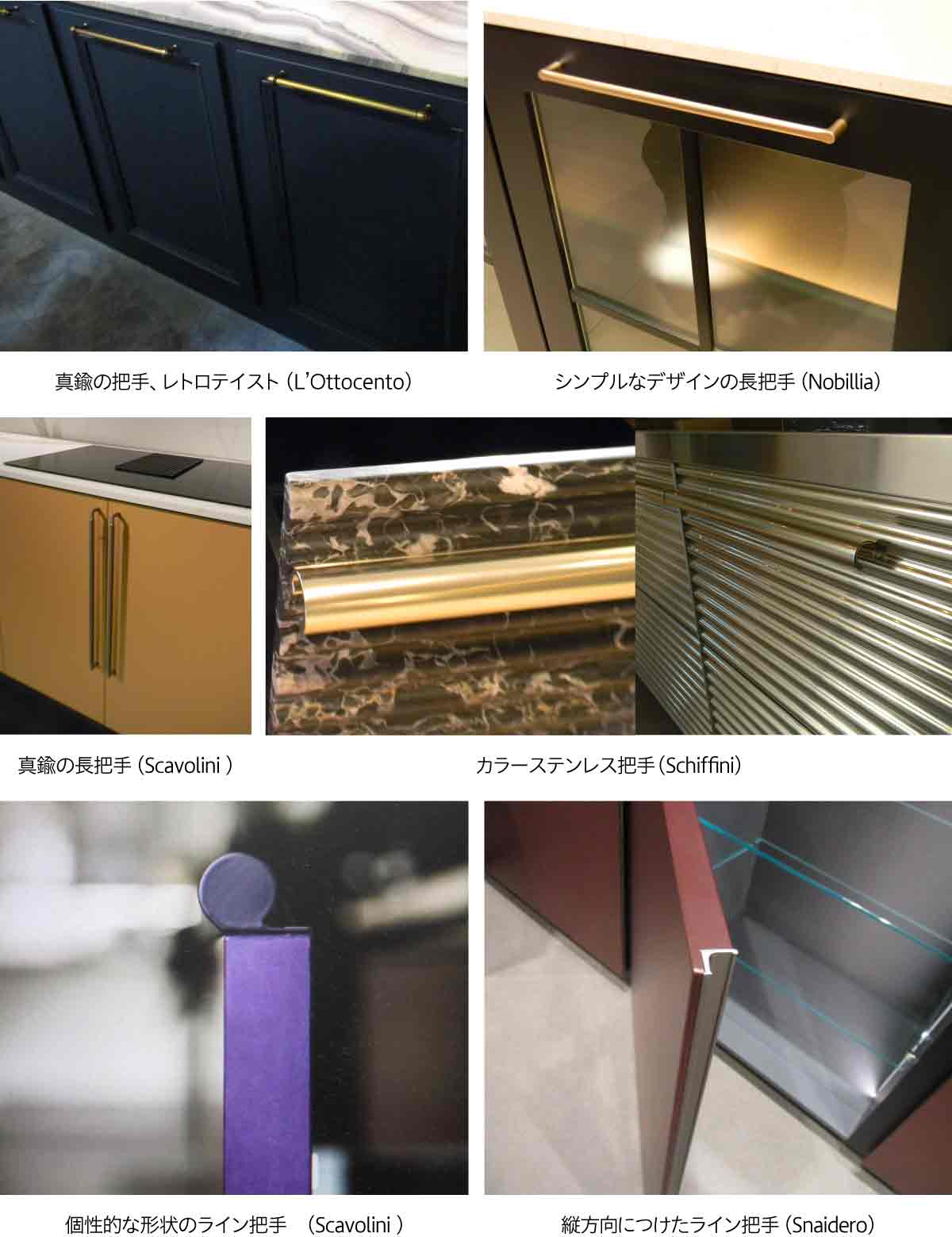 プッシュオープンの扉が増える中、框扉などのデザインポイントになっていた丸形のつまみはほとんど姿を消していますが、シンプルな細く長いハンドル型の把手は多く目にとまりました。レトロモダンなテイストには真鍮、カラーはゴールドが多くなっています。