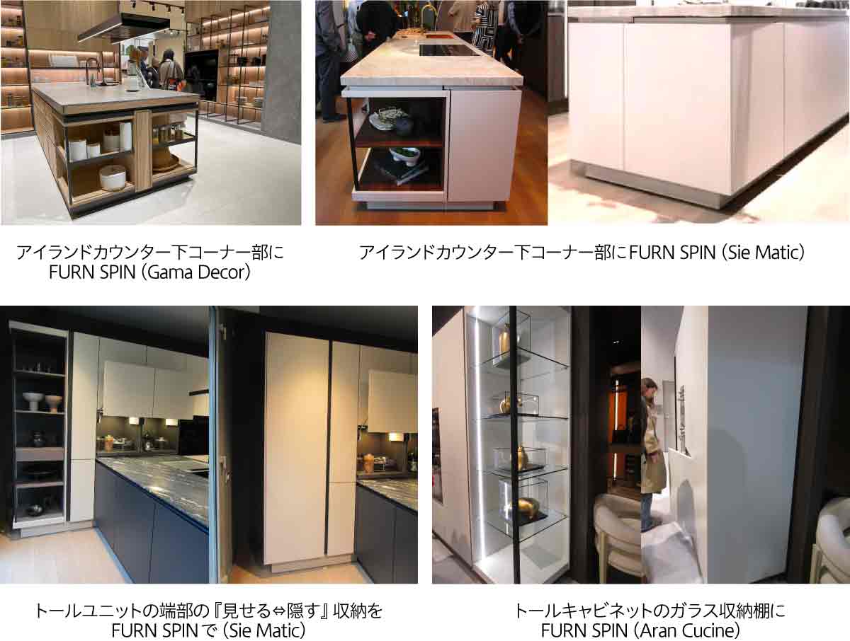2023年インターツムにてアワードを取ったFURN SPIN(ヘティヒ社)の回転収納パーツ。キャビネットを水平にくるりと回転させキャビネット内部を『見せる、隠す』を簡単な操作で可能にしました。