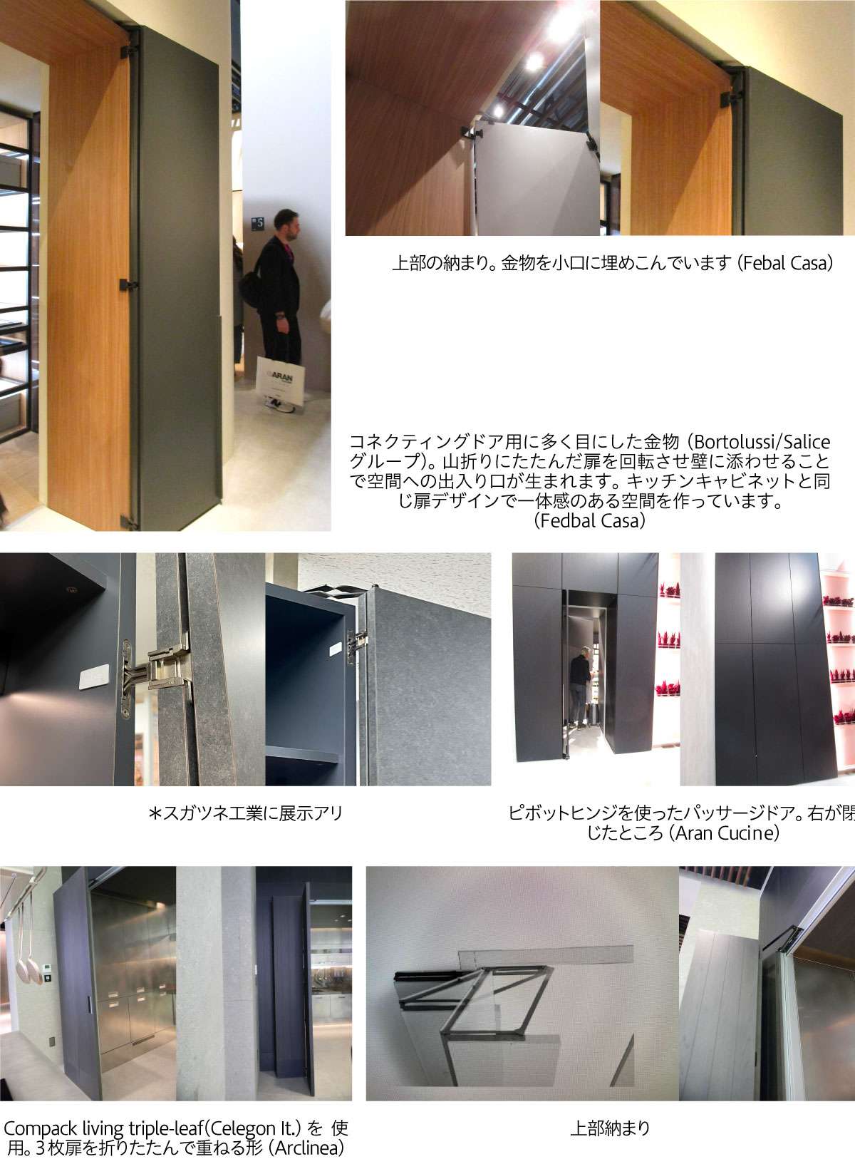 大開口のキッチンバック部の扉を『開いて・閉じる』ポケットドアに最も多くみられた金物です(HAWA、Blum)など。ワンプッシュで扉を山折りにしてスライドさせ袖壁に引き込む仕組みです。