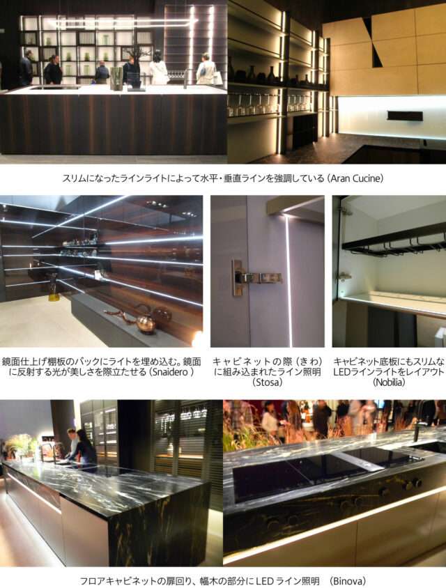 空間に驚くべき効果をもたらす照明デザイン。年々進化し、スリムになったLEDラインライトは今年のキッチンデザインのハイライトです。消費電力の大幅減、長寿命、カラーセレクト、調光など、美しさと機能の双方を実現させるLEDライトがキッチンのデザインを変える大きなエレメントになっていました。