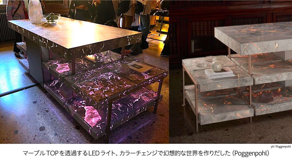 地球の恵みをそのまま使うという傾向に後押しされて予想以上に多くのメーカーが採用しています。無垢材(木)・天然石・土などのローマテリアルの中でもとりわけ天然石の存在感が目立っていました。クオリティの高い素材=長く使える=エコ・サスティナブル、という構図が消費者の中にも徐々に浸透してきているようです。