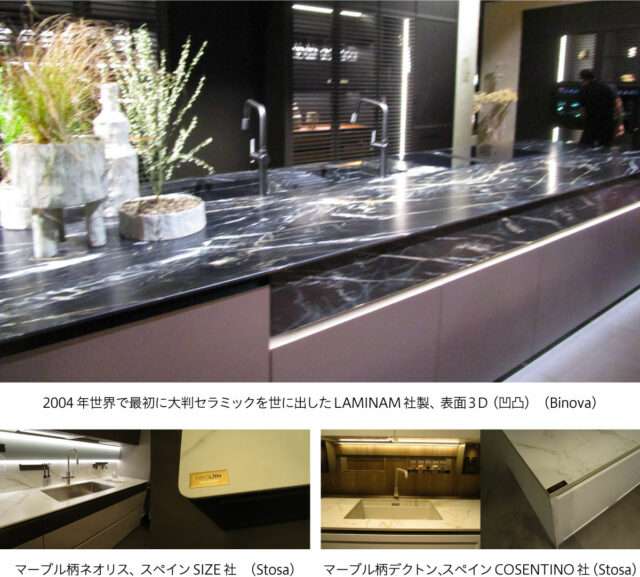 天然石と並んで多くのメーカーが採用した焼結石は天然素材を使って作られた人工石。デジタルプリント技術の進化によりカラーやパターン(柄)テクスチュアを自在に作成することが可能で、天然石と区別がつかない、あるいはそれ以上の完成度の高いパターンも作られています。(TOPに貼ってあるクレジットでようやく見分けがつくほど!)