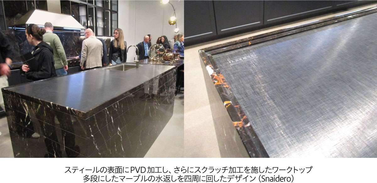 メタルをベースにPVD加工を施し、さらに表面にスクラッチ加工も加えたワークトップも登場しました。