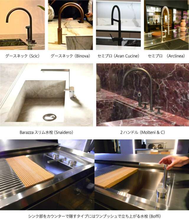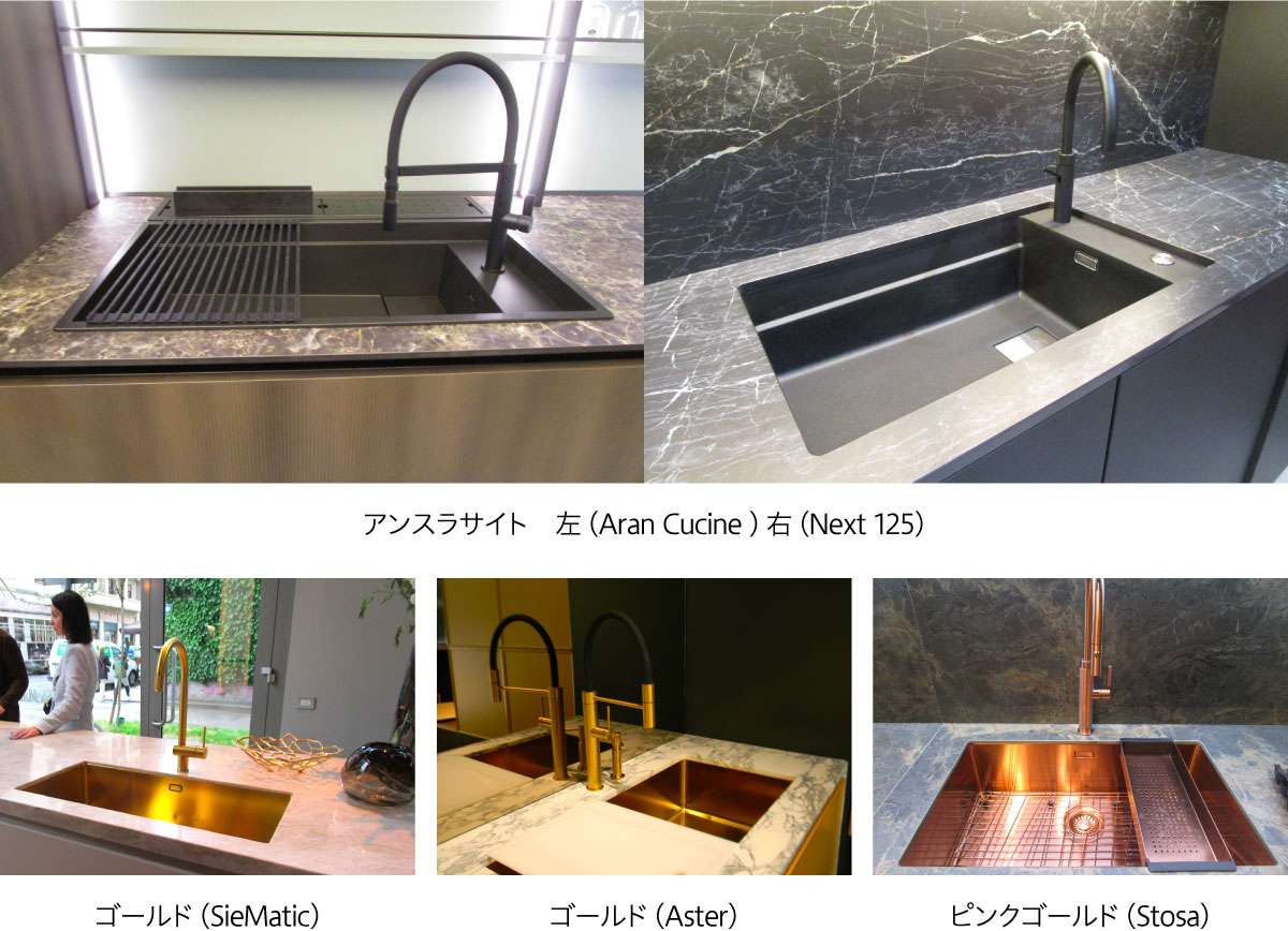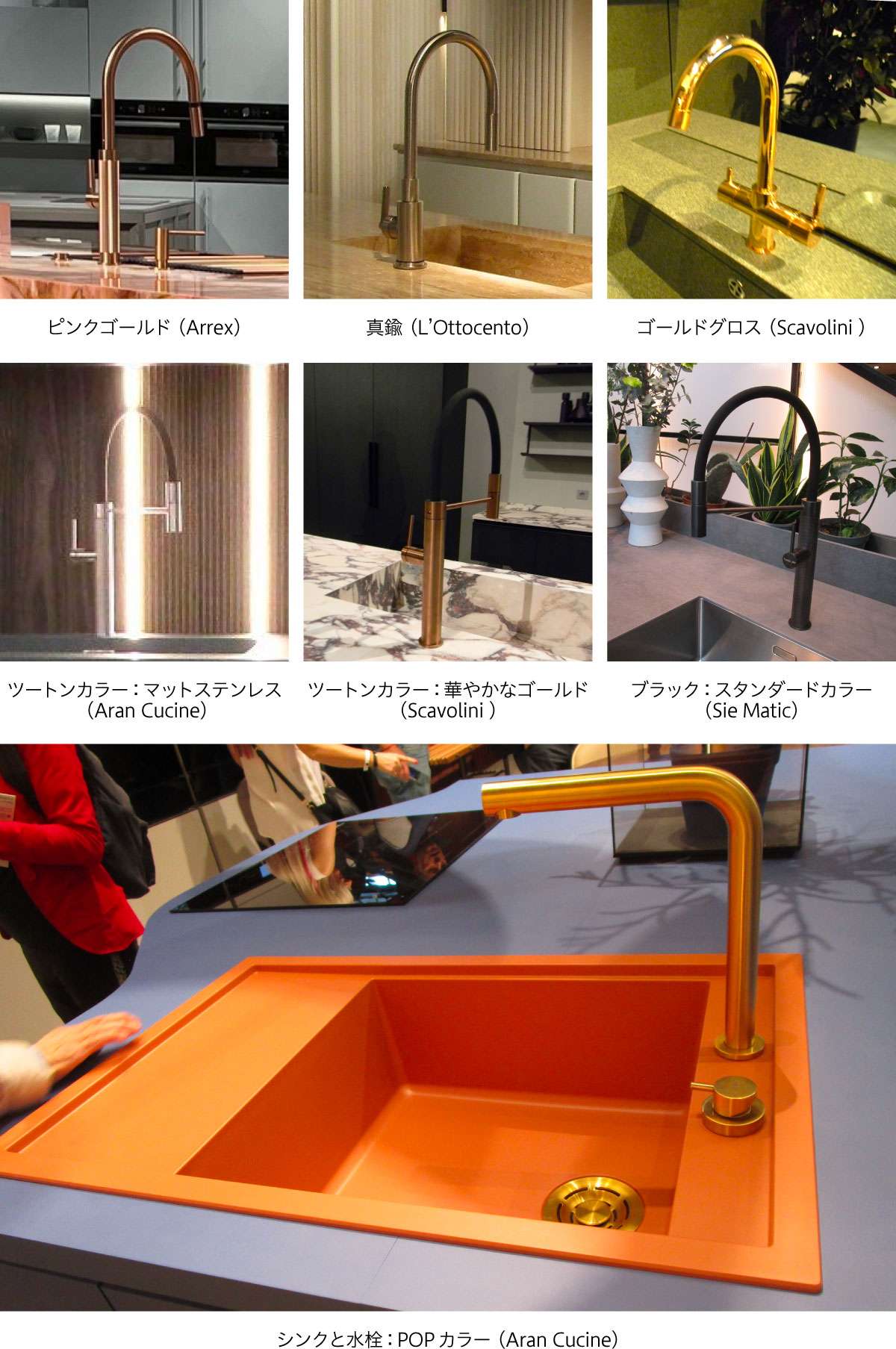 ブラックカラーが主流。天然石を使ったラグジュアリなキッチンにはゴールド(グロス&マット)や、ツートンカラーの水栓。カラーシンクとコーディネートしたカラー水栓がPOPな空間に使われました。