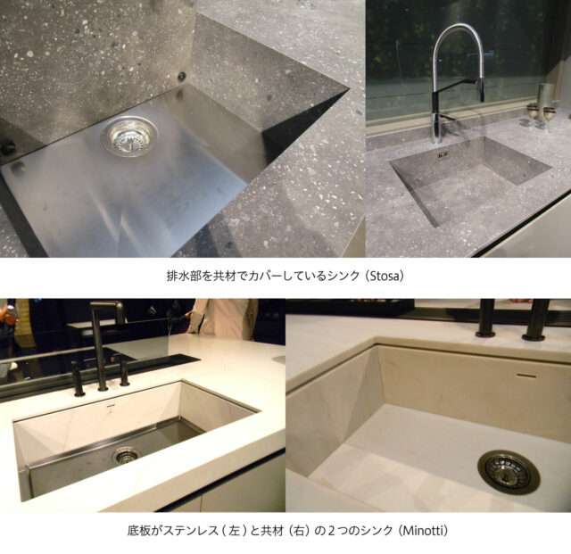 既成シンクのカラーとしてはブラック・アンスラサイト・ゴールド(真鍮)、天然石や焼結石ではワークトップ共材です。