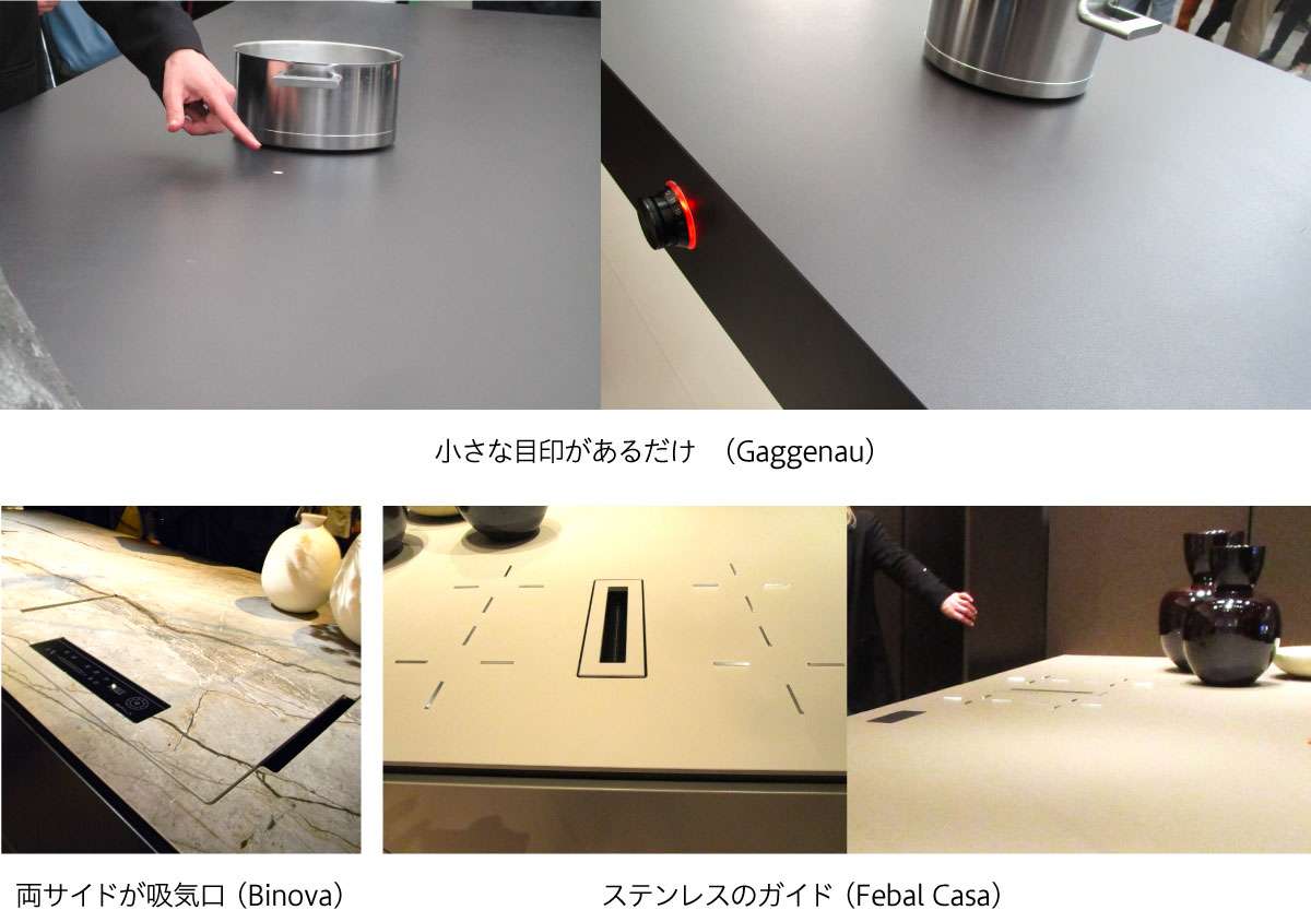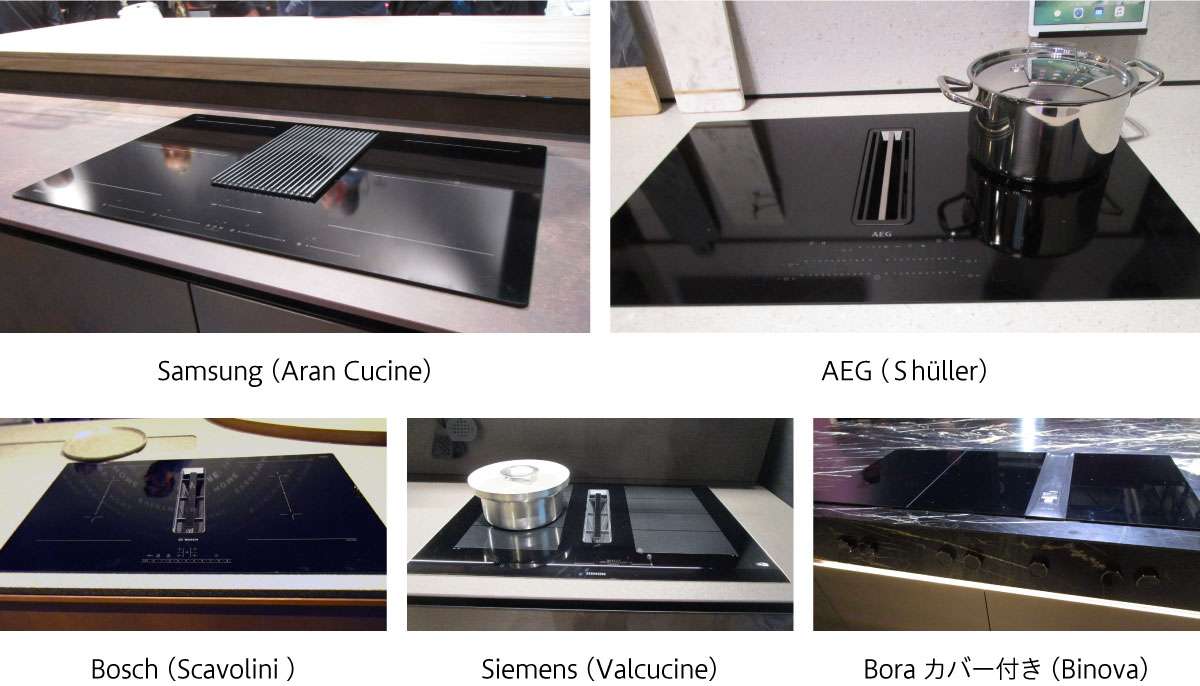 ダウンドラフト(下引き換気扇)を組み込んだクックトップは1m/秒という高速吸引力により油煙と水蒸気を瞬時に吸い込む機能を備え、油煙をまき散らすことなく空間をクリーンに保つことができます。多くのデザインバリエーションが用意されていました。