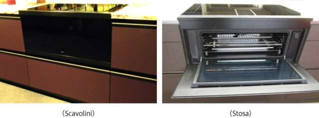 加熱調理の多くをオーブンが担っている欧米のクッキングスタイル。使い勝手の良いアイレベルの高さに複数をビルトインして使います。スティーム機能・複数同時調理機能などを搭載した電気オーブンに加えて、コーヒーメーカーやバキュームドローワー、ウォーマー、ブラストチラー(急速冷凍機)などをニーズに合わせて組み合わせています。
