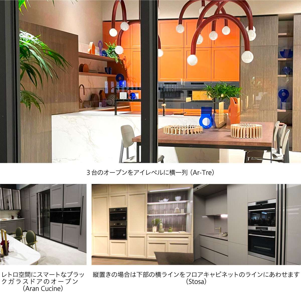 異なる機能を持つ機器を複数台並べてアイレベルの壁面にビルトイン。縦・横と並べ方は様々です。