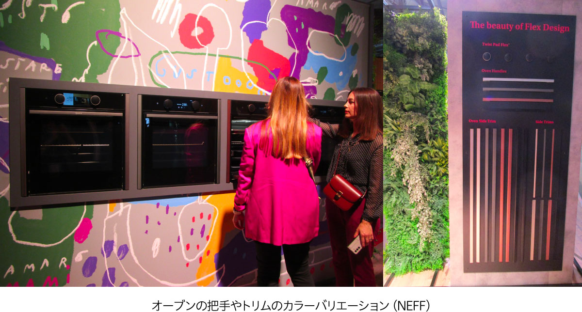 キッチン空間のカラー化を受けて、ビルトイン機器においても操作ハンドルやトリムをカラーチェンジするパーツなども提案されました。