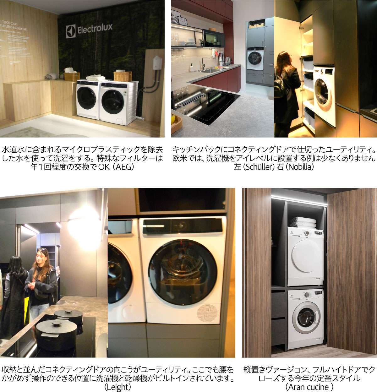 一続きの大きな空間に暮らしのすべてをレイアウトして見せた2024年のEuroCucina&FTK では洗濯機も展示に参加しています。省エネ・節水などに加えて、使用する水に含まれるマイクロプラスティックをフィルターを使って取り除く機能を持たせた洗濯機は地球環境を守る小さな取り組みの一つでした。