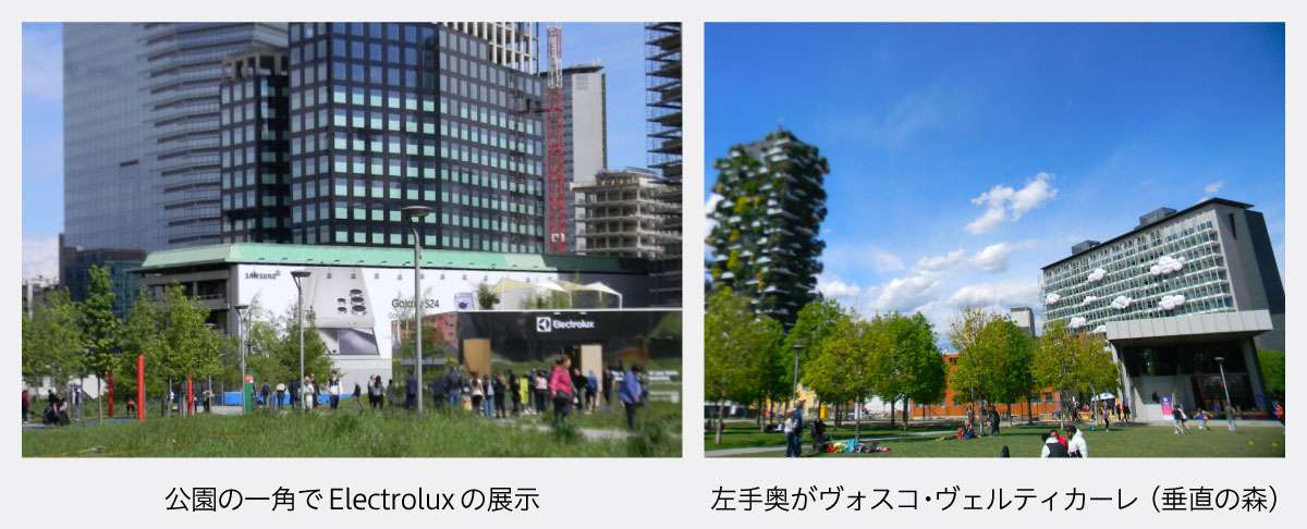 写真は21世紀に入ってから進められているミラノの再開発プロジェクトの第一号、 ポルタガリバルディ地区、LEED®とWELL®の両方のコミュニティ持続可能性認証を取得した世界初の地区。アイコンとしての建築ヴォスコ・ヴェルティカーレ(垂直の森)が青空に向かってそびえたっています。サローネ取材の合間にちょっと一息、芝生に寝転んで青空と緑を堪能しました。