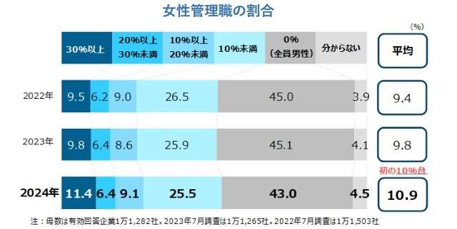 帝国データバンク(東京都港区)はこのほど、「女性登用に対する企業の意識調査(2024年)」の調査結果を発表した。それによると、女性管理職(課長相当職以上)の割合は、平均10.9%(前年比1.1ポイント増)と調査開始後初の10%台となり、上昇幅も2021年と並ぶ過去最大となった。