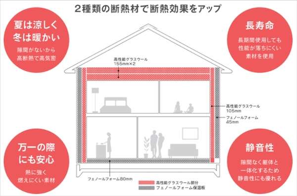躯体は、柱・土台にヒノキ集成材を標準採用し、通し柱の接合部に構造金物を用いた木造軸組メタル在来工法とし、高性能グラスウール+フェノールフォームのW断熱と気密施工により、UA値0.37W/㎡Kの断熱性能を確保する。