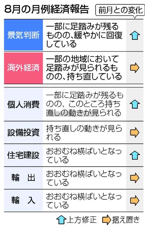 政府は8月29日公表した8月の月例経済報告で、景気の総括判断を2023年5月以来15カ月ぶりに上方修正した。「一部に足踏みが残るものの、緩やかに回復している」との表現に改めた。所得の持ち直しなどを背景に、個人消費の判断を15カ月ぶりに引き上げたほか、企業収益や設備投資の好調持続も支えとなった。