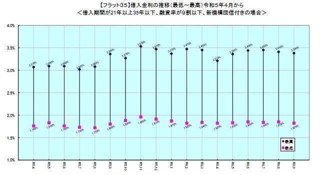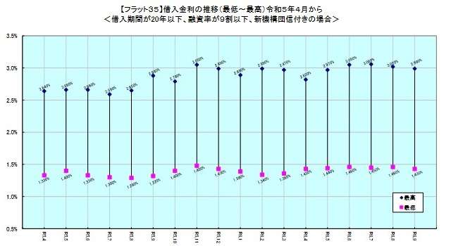 返済期間20年以下の「フラット20」の最低金利は、融資率9割以下が1.43%、9割超が1.54%で、前月から0.03ポイント下がり、2カ月ぶりに下降。最高金利は、9割以下が2.99%、9割超が3.10%と、いずれも0.03ポイント下降した。