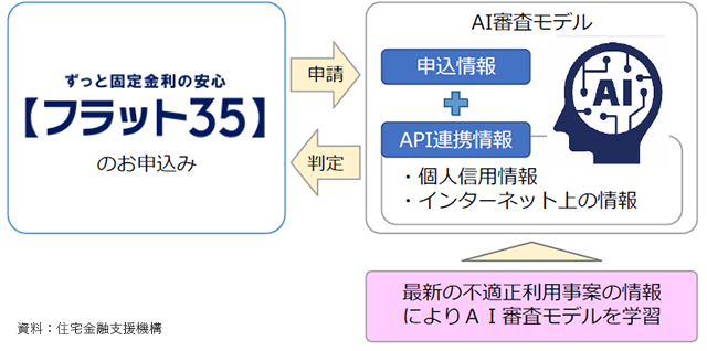 「AI審査モデル」では、これまでに同機構が取得・蓄積してきた「フラット35」の申込内容や、不適正利用事案の情報、個人信用情報、インターネット上の情報をAPI連携により外部から取得。 その情報を基にAIが総合的に審査を行う。加えて、最新の不適正利用事案の情報を活用したAI審査モデル学習を実施する。