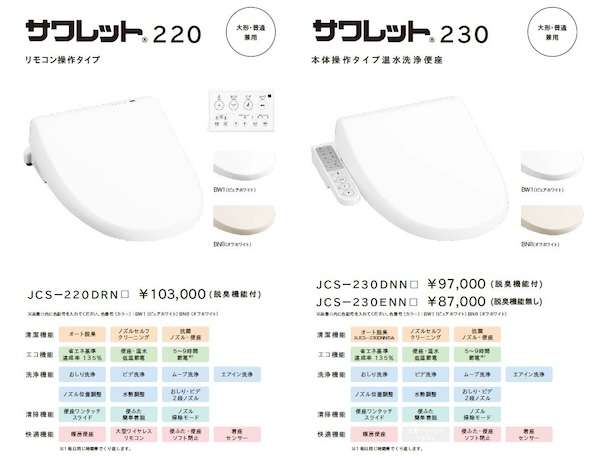 また、温水洗浄便座「サワレット」をモデルチェンジして2機種をラインアップ。 やわらかなフォルムとし、省エネ性能を大幅に向上した(省エネ達成率135%)。8万7000円〜。