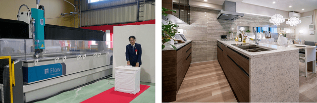 左:9月6日の竣工式の様子、右:フィオレストーン使用例(キッチン天板・側板)