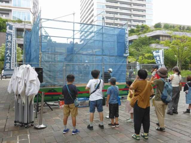 JR武蔵小金井駅近くの広場に足場を組み、24日9時過ぎから建て方がスタート。大工らは佐藤理事長の指示を受けながら約2時間で上棟までを終えた。会場では、小金井市在住のミュージシャン・マスター木村さんが軽快なトークで通行人の関心を引いた。途中、大工に仕事の楽しさ、やりがいなどについてインタビューし、見学者にもマイクを向けて大工の仕事ぶりを見た感想を聞くなどして、会場を盛り上げた。