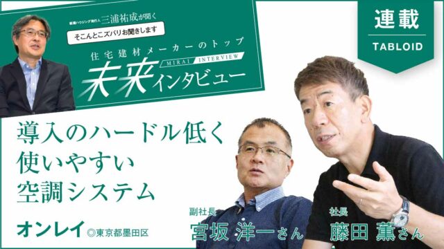 住宅業界の市況が厳しくなる中、地域工務店に設備を提供するメーカーの役割に注目が集まる。多種多様な設備の魅力は、工務店の価値にもなる。本連載では、建材・設備メーカーのトップに、新建ハウジング発行人・三浦祐成が「今こそ聞きたい未来の話」を深掘りする。第4回は、床下冷暖房「ECO床暖システム」を開発するオンレイ社長の藤田薫さんと副社長の宮坂洋一さん。低コストで導入しやすいシステムを開発しながら、より使いやすくなる技術・熱意を製品に込めてきた。工務店にとって“全館空調”は、差別化になり得るのか。トップの真意に迫った。