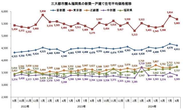 福岡県は3737万円(2.2%増)と2カ月連続上昇したが、平均土地・建物面積は縮小している。福岡市は4289万円(1.5%減)と下落に転じた。
