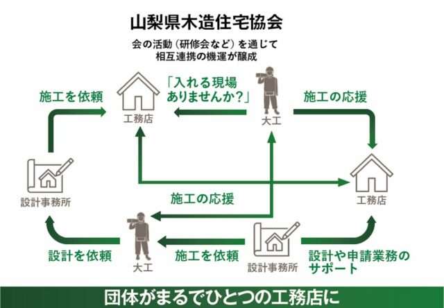 住宅業界を覆う人手不足の波を、工務店や設計事務所が、設計や施工などそれぞれの力を“融通”し合うことで乗り越えているのが山梨県木造住宅協会(山梨県南アルプス市)だ。会員に設計事務所や小規模な工務店が多かったため、自然と相互協力の機運が醸成された。また協会の活動を通じて会員のベクトルがそろいつつあることも、連携に好影響を及ぼしているという。【編集部 荒井隆大】
