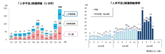 同調査は、2024年1-8月の全国企業倒産(負債1000万円以上)のうち、「人手不足」関連倒産(求人難・従業員退職・人件費高騰)を抽出・分析した。(後継者難は対象外)