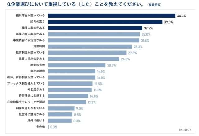 賃貸マンション、リノベーションホテルの運営などを手がける大和ライフネクスト(東京都港区)は、就職活動中の学生400人(2025年3月卒業予定)を対象に「就職に関する調査」を実施した。それによると、企業選びにおいて重視していることの1位は「福利厚生が整っている」(44.3%)だった。2位は「給与の高さ」(39.8%)、3位は「職種に興味がある」(32.8%)となった。