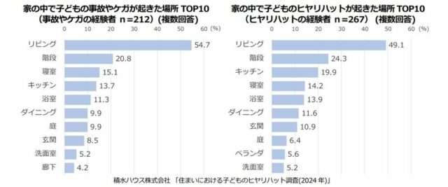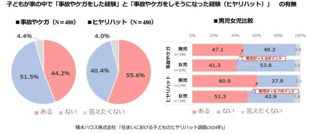 積水ハウス(大阪市北区)が0歳から小学2年生までの子どもを持つ全国の男女480人を対象に行った「住まいにおける子どものヒヤリハット調査(2024年)」で、家の中で子どもが「事故やケガをしそうになった経験(ヒヤリハット)」がある人が半数以上にのぼり、中でも3歳以下が多いことがわかった。女児と比べ男児のほうが8.7ポイント高かった。また、ヒヤリハットは、大人がいて見守っていた中で起きた人が5割以上であることも判明した。