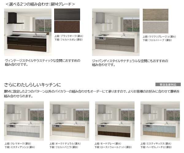 扉色にはトレンドを反映したくすみのあるニュアンスカラーの木目柄や石目柄をラインアップし、異なる2色を組み合わせたバイカラーのコーディネートも選べる。