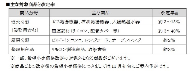 値上げ幅は、ガス給湯機器、石油給湯機器、太陽熱温水器が約3~15%、関連部材(リモコン、配管カバー等)が約3~40%。ビルトインコンロ、レンジフード、オーブンレンジが約2%。修理用部品(リモコン関連部品、取扱書等)が約3%。